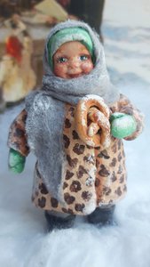 Елочная игрушка "Девочка с баранкой" выполнена в стиле советских ватных игрушек. В работе использовался материал: проволока, хлопковая и льняная вата, клей пва, акриловые краски, акриловый лак, полимерная глина для лепки личика. У игрушки имеется металлический крепеж для подвески.